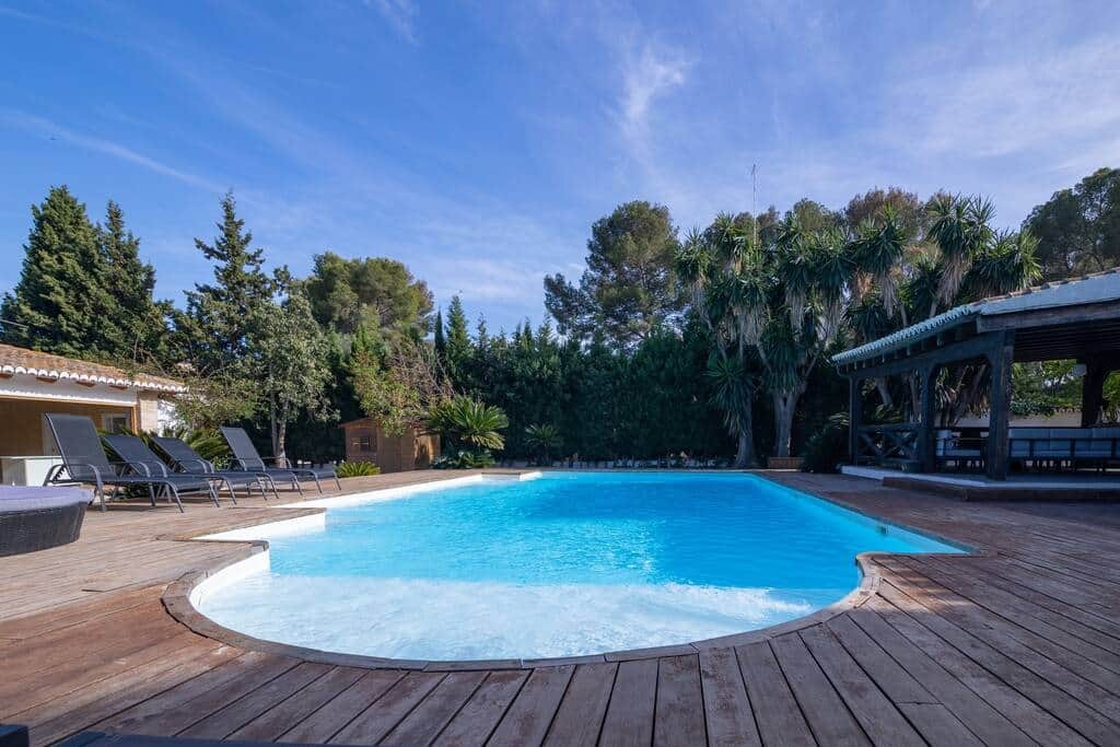 Luxury villa with magnificent pool and large plot. Very beautiful, spacious, and well-maintained garden. It features a spectacular pool, sauna, hot tube, beer tap bar, barbecue, covered parking, spacious covered porch, wooden deck around the pool, perfect orientation maximizing privacy and ensuring no neighbors can see inside the plot, pool, or terrace. Residential and peaceful area in the metropolitan area of Valencia. 20 minutes walking from the "La Vallesa" metro station. 20 minutes drive to Valencia.